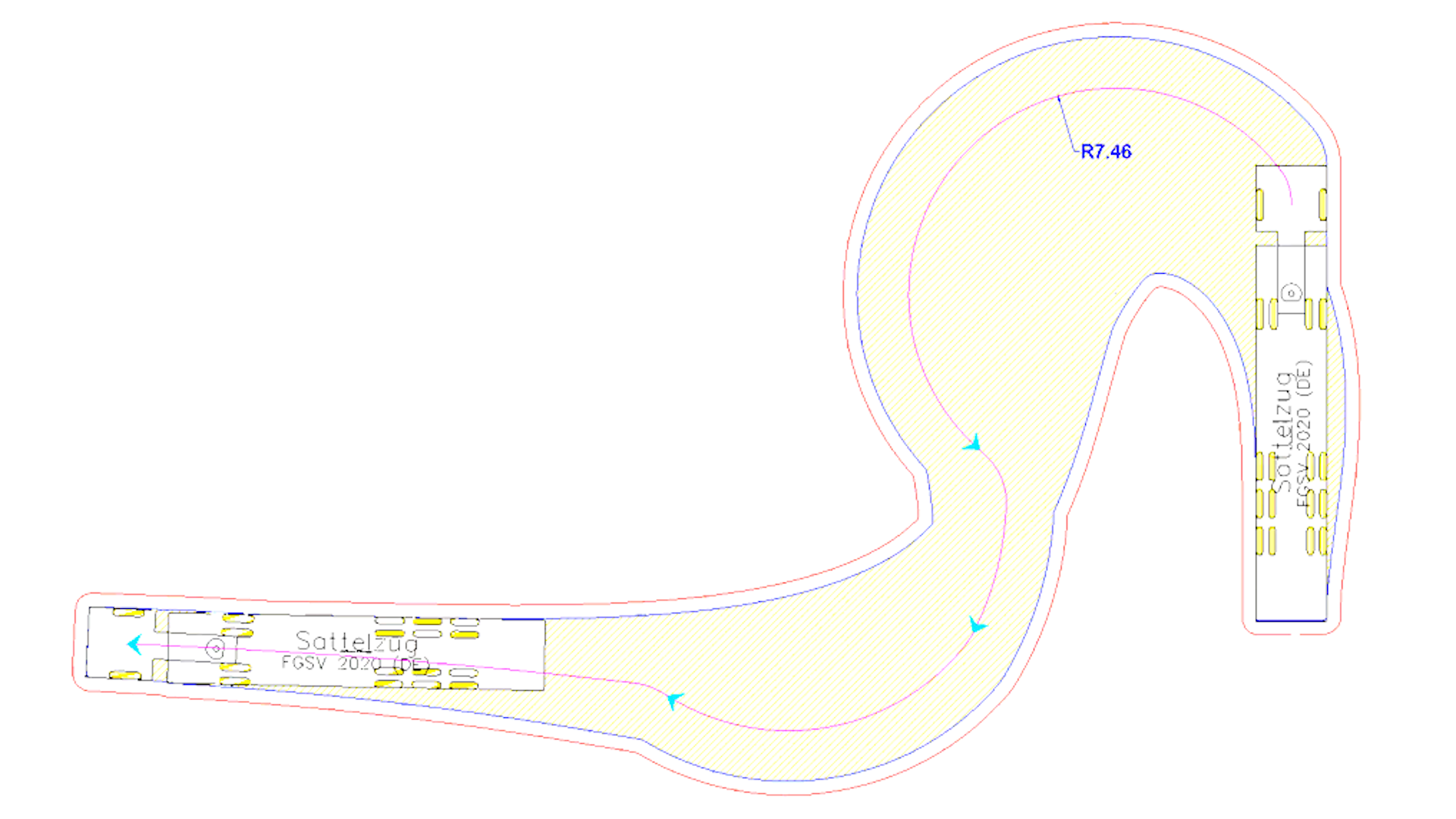 180°-Linkskurve mit anschließender 90°-Kurve mit dem Bemessungsfahrzeug FGSV-Sattelzug (2020)
