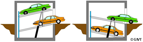| Kipp-Parker ermöglichen ein besonders kompaktes Parken, schränken aber die Benutzerfreundlichkeit erheblich ein und lassen auf der oberen Plattform nur Fahrzeuge mit niedrigem Heck zu |