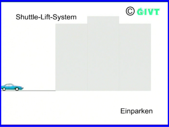 | Beim vertikalen Parkregal mit nur einer Regalreihe werden die abzustellenden Fahrzeuge nach dem Transport auf die entsprechende Parkebene in den Stellplatz unmittelbar neben dem Vertikalförderer eingelagert. Dieses System gestattet eine besonders Grundfläche sparende Systemgestaltung in unter- oder oberirdischer Bauart und ist gut modular einsetzbar. |
